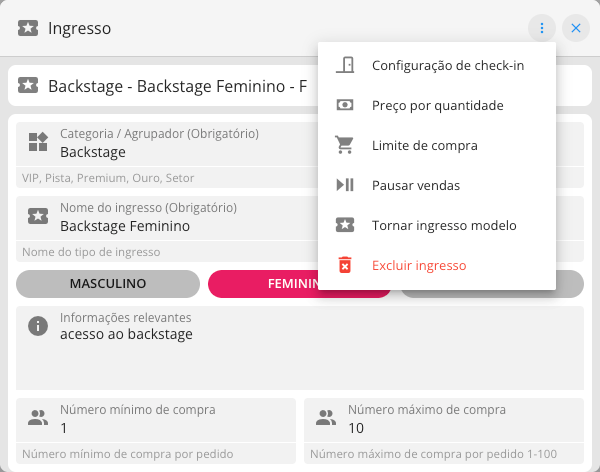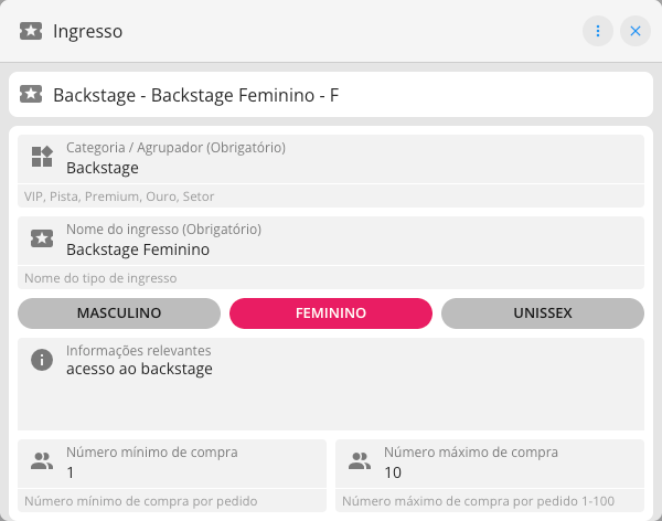 Regras diferentes por ingresso (VIP, backstage, meia, pacotes, unissex etc.)